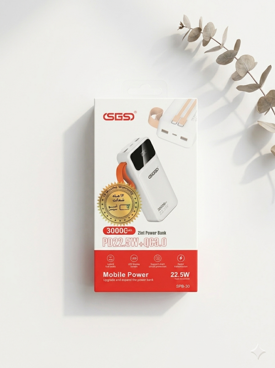 -ظرفیت قوی 30000mAh: با این ظرفیت بینظیر، پاوربانک SGS SPB-30 میتواند چندین بار دستگاههای شما را بهصورت کامل شارژ کند، بنابراین نیازی به نگرانی درباره خالی شدن باتری در طول روز نخواهید داشت.